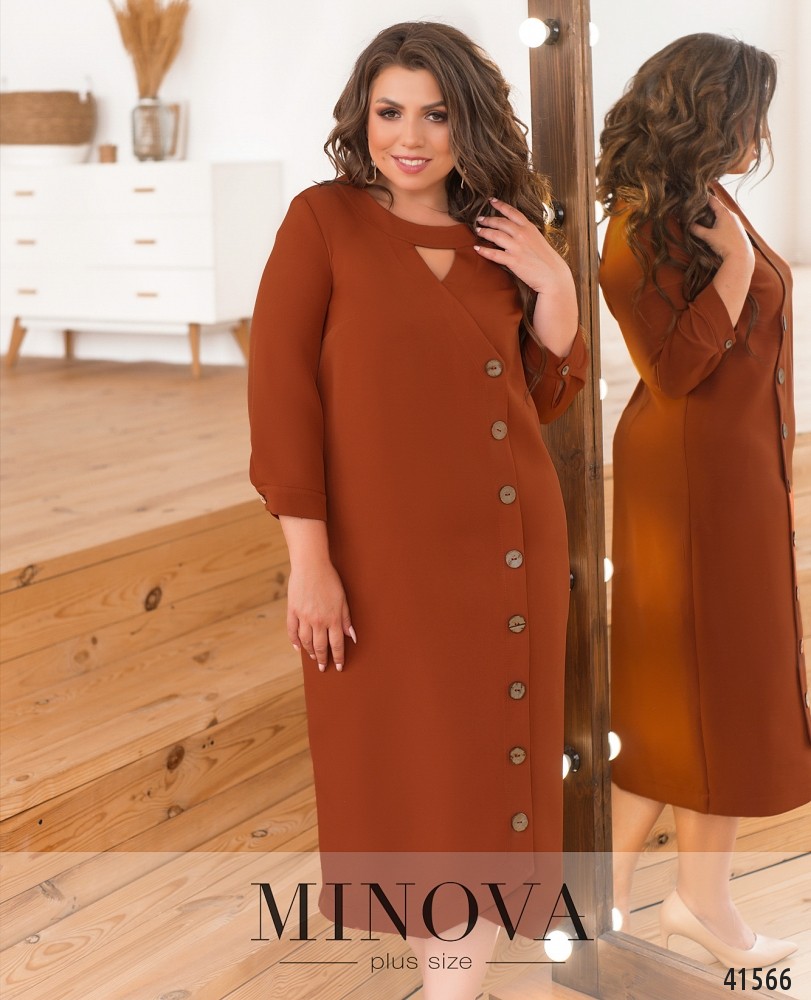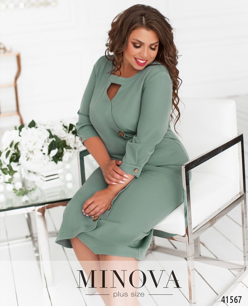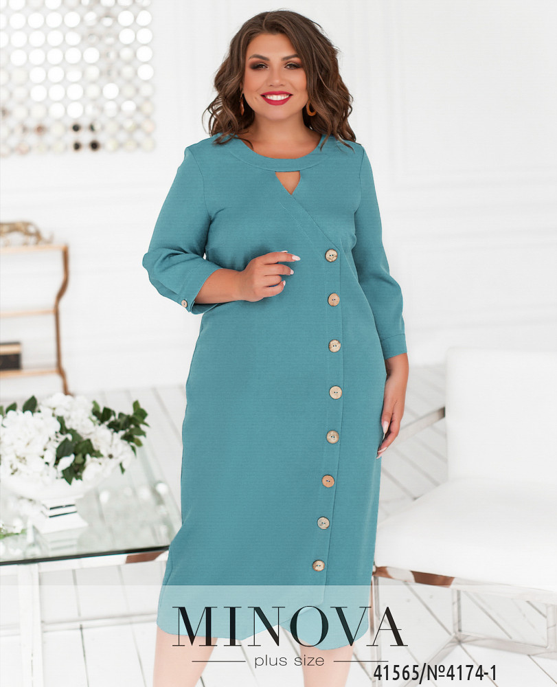 Оригінальна сукня плюс сайз з низкою декоративних гудзиків спереду на планці. Рукава з невеликими манжетами. На манжетах по одному гудзику. Виріз горловини півкруглий, під ним - невеликий трикутний виріз. На грудях виточки, кишень немає, силует приталений. Застібається на блискавку, вшиту по спинці.