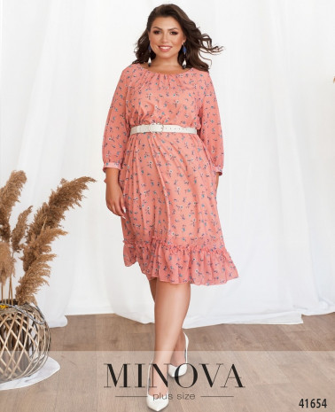 Чарівна сукня батал з оборками на подолі, виріз горловини півкруглий, тканина під ним призібрана. Cукня з приталеним силуетом. Рукава з манжетами. На манжетах зав'язуються стрічки. Внизу під верхнім шаром - м'яка підкладна тканина. Без застібок та кишень.