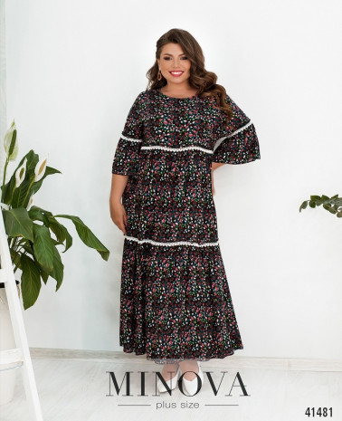 Очаровательное платье большого размера с цветочным принтом. Застёжек и карманов нет, вырез горловины полукруглый, подол с подшитыми мягкими оборками. Рукава без манжет.