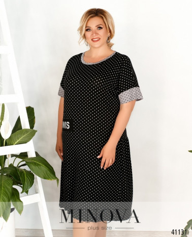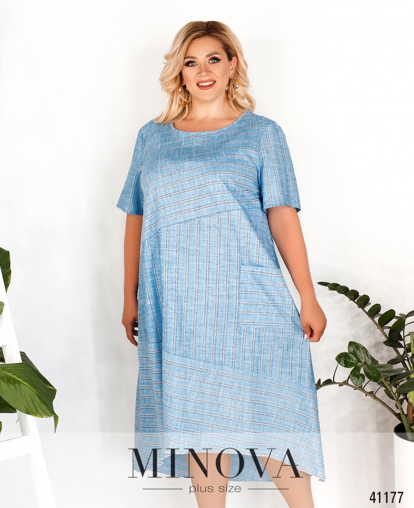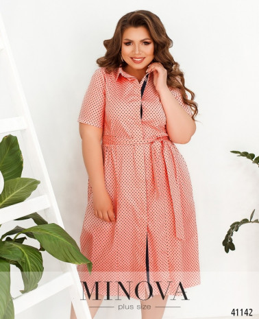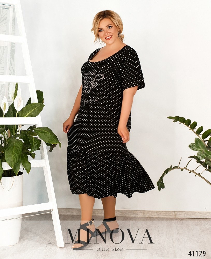 Яркое, нежное и женственное платье батал с подолом, присобранным мягкими оборками и отделённым от верха широкой полосой. Застёжка - вшитая по спинке потайная молния, карманов нет. Вырез горловины V-образный, рукава свободные, без манжет.