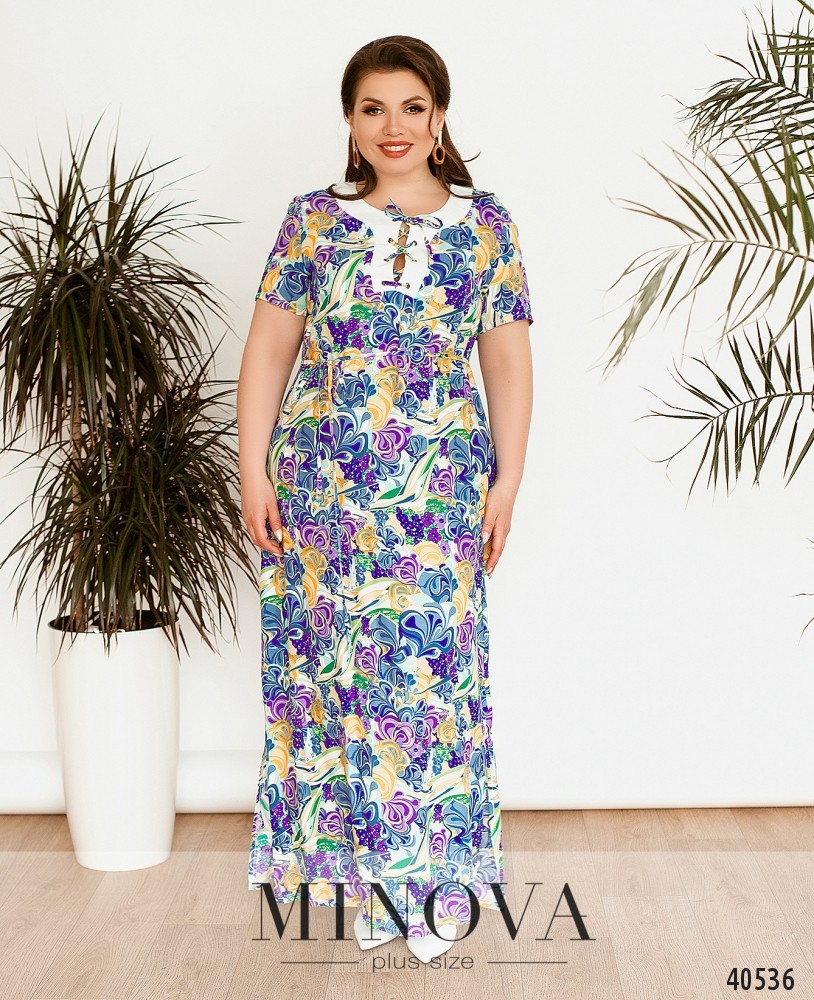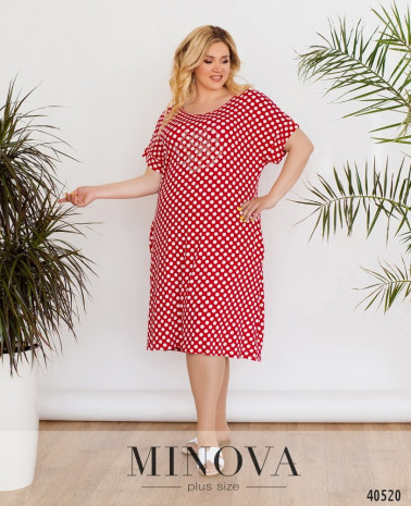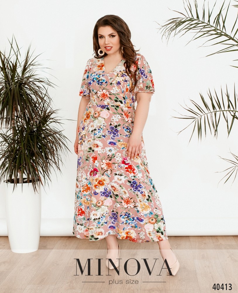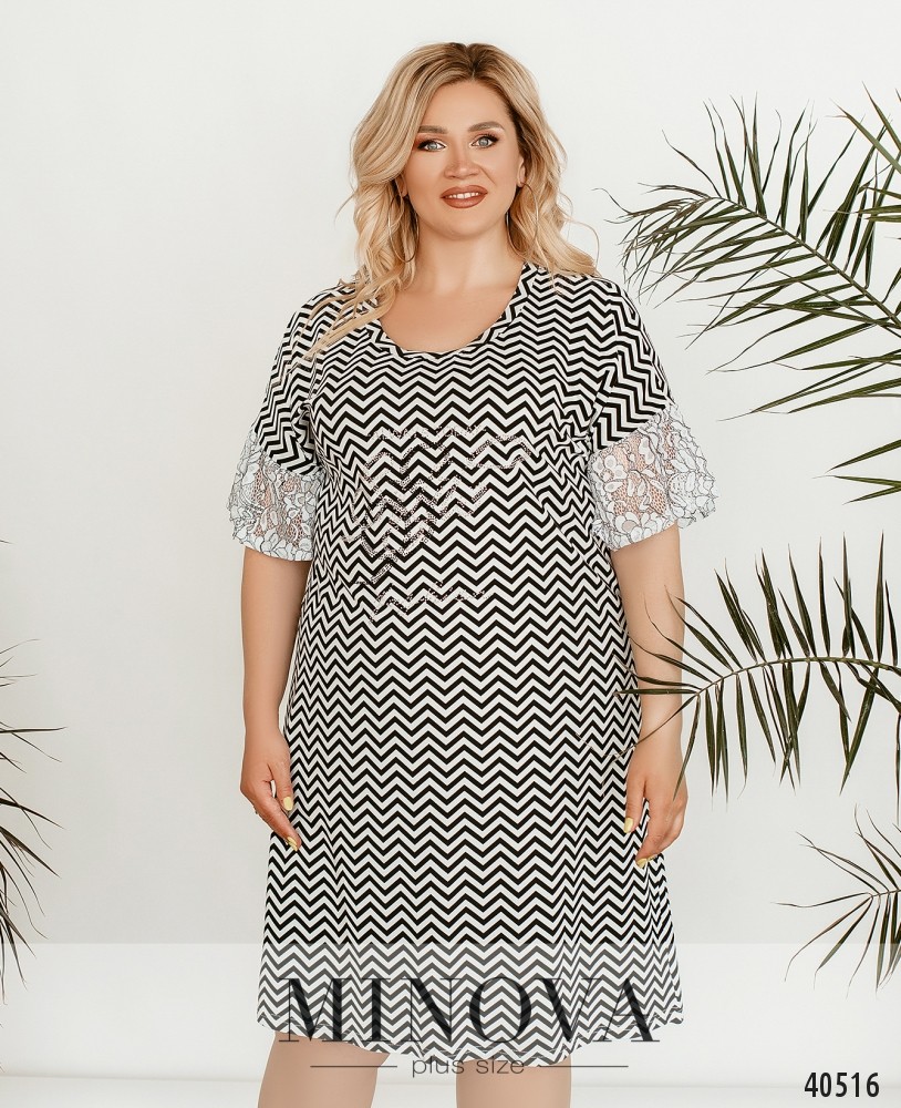 Чарівна сукня батал без застібок, з вирізом горловини "човник", з обох боків - прорізні кишені, рукава короткі, з відворотами. На грудях - квітка, викладена зі стразів. Прикраса входить до комплекту.