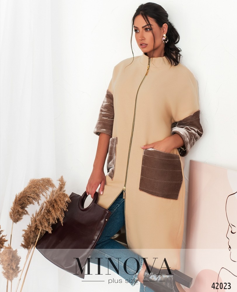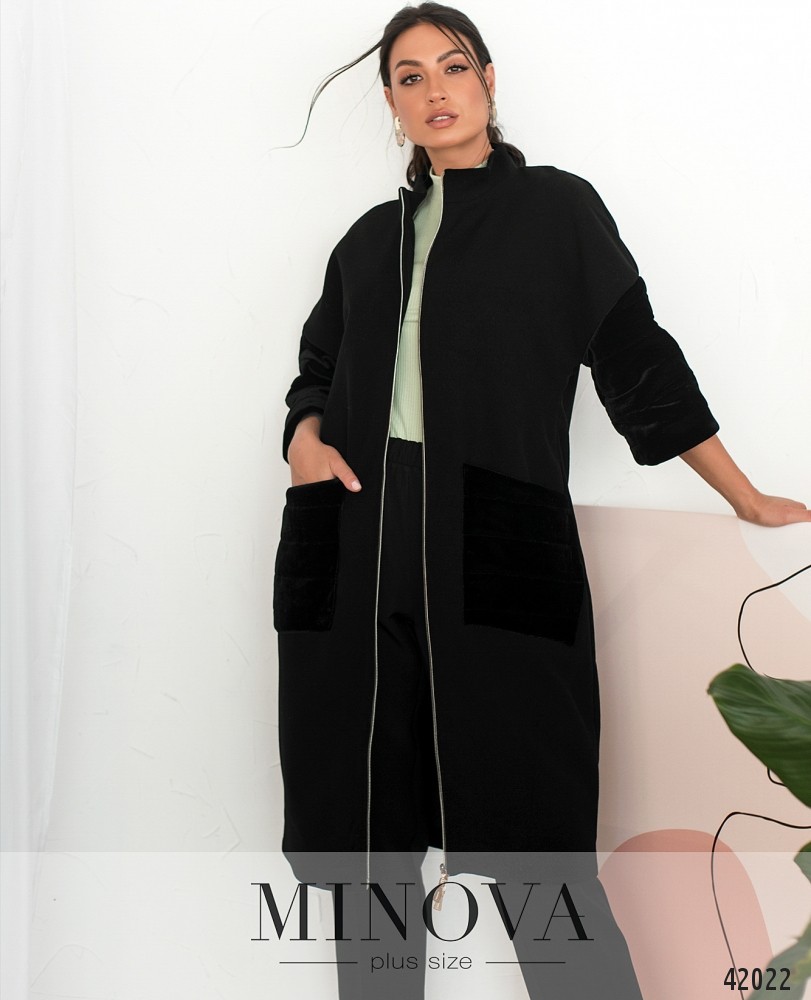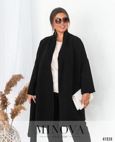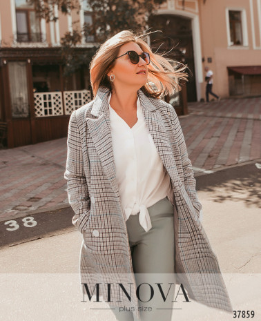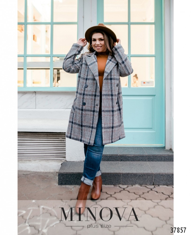 Елегантне двобортне пальто батал без підкладки, лацкани різьблені, з боків - накладні кишені. Рукава без манжетів. Застібається на лівий гудзик. На грудях виточки.