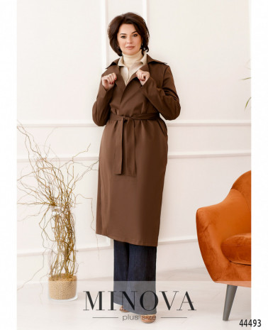 Привабливий мінімалістичний плащ без підкладки і застібок, ззаду на подолі велика шліца. На поясі з боків шлівки. Лацкани різьблені, з широкими відворотами, комір відкладний. Пояс/аксесуар входить в комплект.