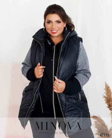 Тёплый и стильный жилет большого размера, с подкладкой, застёгивается на молнию спереди по центру. По бокам - врезные карманы. Ткань простёгана. Жилет без капюшона.