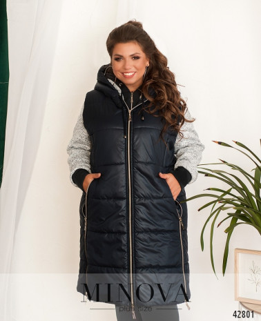 Длинный простёганный жилет батал, по бокам - врезные карманы под молнией, молния продолжается ниже и расстёгивается снизу до карманов. Жилет с капюшоном и подкладкой.