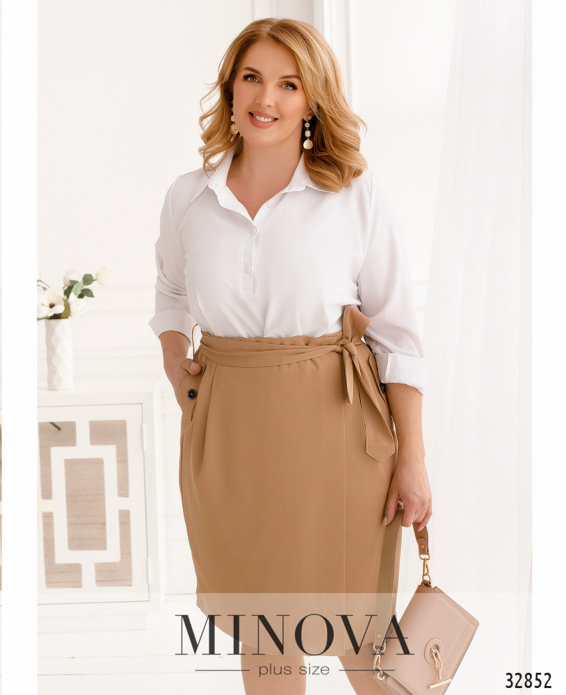 Белый верх, тёмный низ… Как часто приходится слышать такие требования к дресс-коду на работе или для официального мероприятия. Minova позаботилась о том, чтобы у вас всегда были варианты. Например, классическая юбка прямого кроя прекрасно подходит под это описание, но имеет и нотку оригинальности благодаря ряду функциональных пуговиц спереди и тонкому съемному пояску. Кроме того, вы можете выбрать не только чёрную или тёмно-синюю, но и нежно-бежевую юбку батал. Ткань плотная, не тянется, в наличии карманы и пояс. Прекрасно подойдёт для создания капсульного гардероба за счёт своей минималистичности.