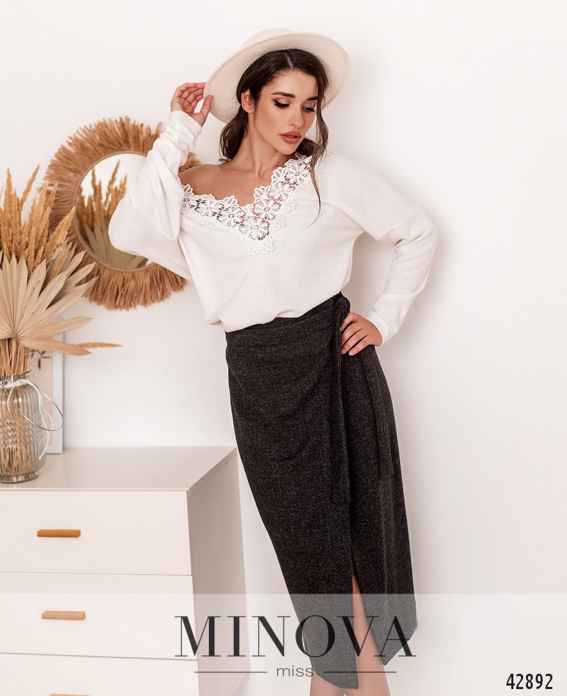 Приваблива спідниця з нашитими спереду поясками, без кишень, застібається на приховану змійку, вшиту зліва. Посадка висока.