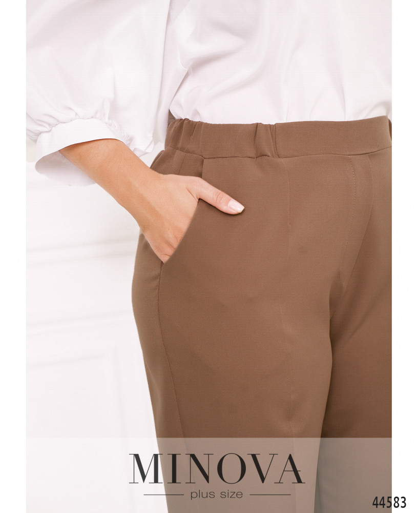 Удобные брюки плюс сайз с высокой посадкой, в пояс сзади вшита резинка, спереди - декоративная ширинка, по бокам - карманы в шве. Без застежек.