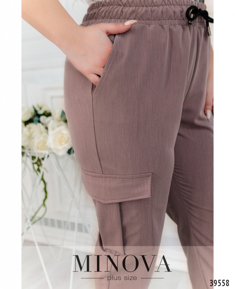 Удобные и стильные повседневные брюки большого размера, в пояс вшита резинка и шнурок, по бокам - врезные карманы и накладные карманы с клапанами, снизу манжеты с резинками.