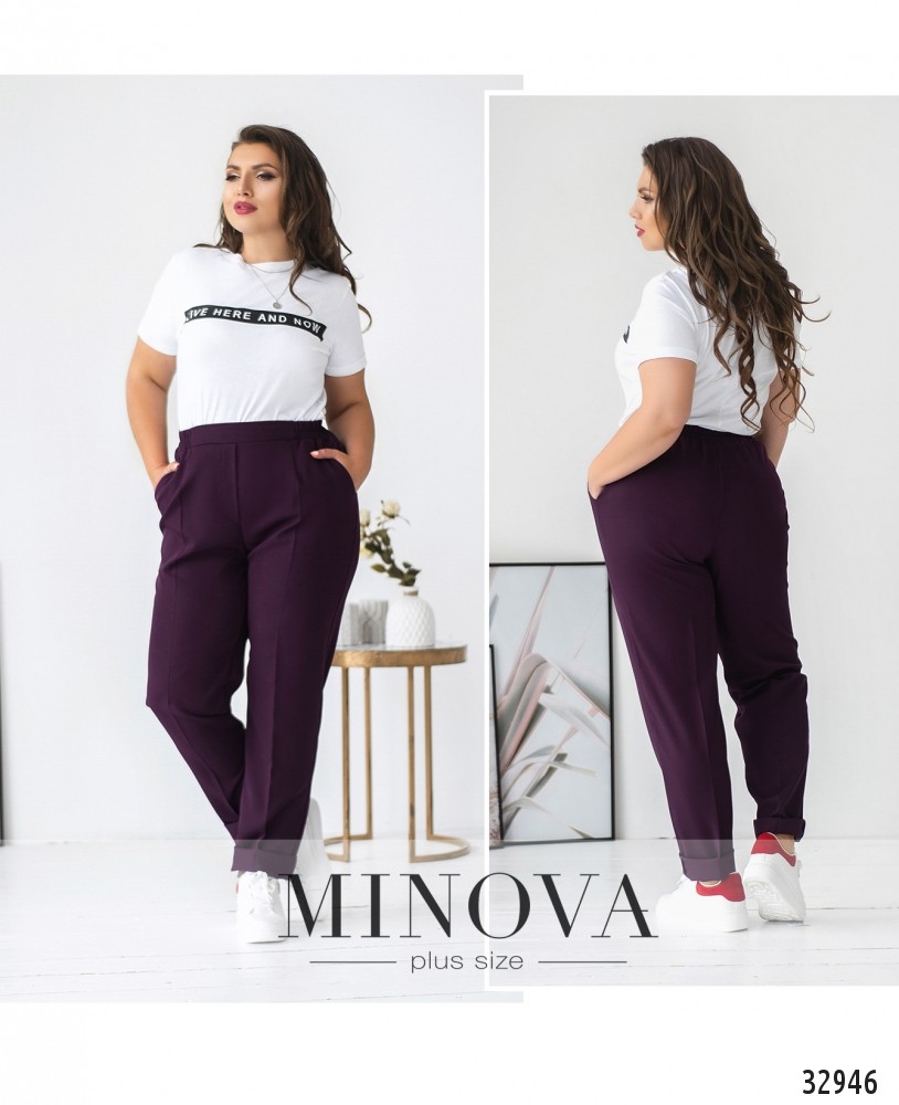 Элегантные брюки батал идеально дополнят твой рабочий наряд и любой другой официальный дресс-код. А если хочется чуть-чуть «пошалить», можно надеть тёмно-фиолетовые, главное, гармонично подобрать цвет рубашки или блузы. Впрочем, белый цвет подходит ко всему, а белых блузочек в новой коллекции Minova более чем достаточно, на любой вкус! Брюки со «стрелками», карманами, а пояс – со вшитой по бокам резинкой, поэтому застёжки не предполагается. Зато есть декоративная ширинка для соблюдения тонкостей классического стиля. Чёрные и серые брюки станут основой твоего базового гардероба!