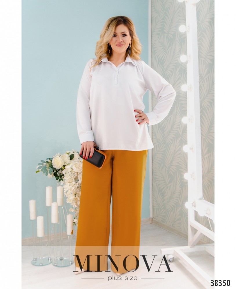 Стильные брюки большого размера, расклешённые от бедра. Посадка талии высокая, застёгиваются на пуговицу и молнию под ширинкой, по бокам - врезные карманы.