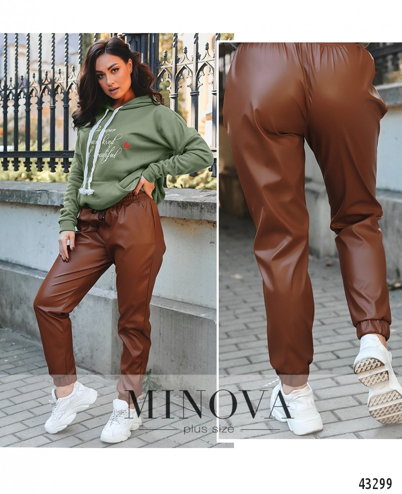 Стильные брюки батал с высокой посадкой, в пояс вшита резинка и пропущен шнурок, манжеты также на резинке. В наличии врезные карманы по бокам.