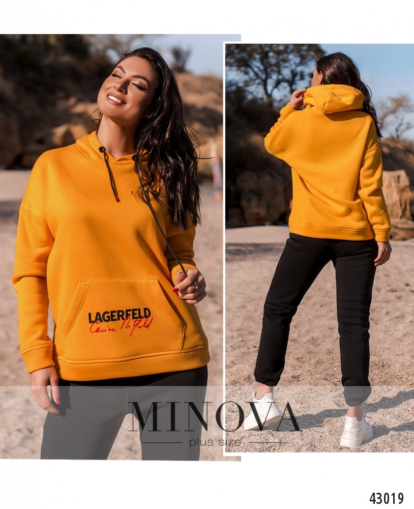 Мягкая толстовка большого размера с накладным сквозным карманом на талии. Через капюшон пропущен шнурок. Рукава и подол с манжетами. Застёжек нет. На груди и на кармане - принты.