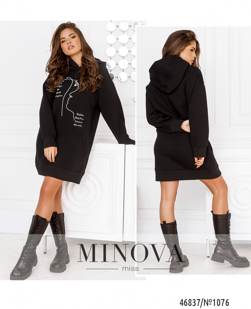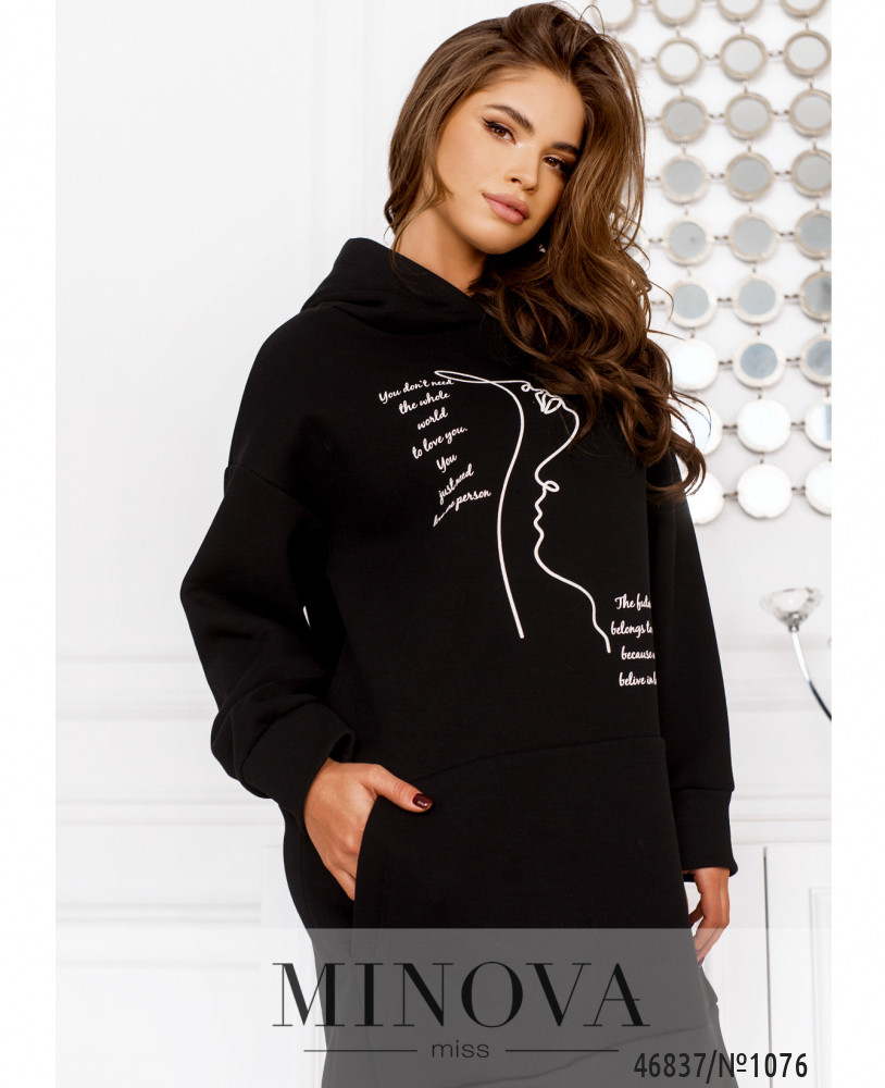 Стильная комфортная туника с принтом отличается универсальностью, а также удачно вписываются в любой стиль. Модель свободного кроя дополнена длинными рукавами с приспущенной линией плеч и капюшоном.