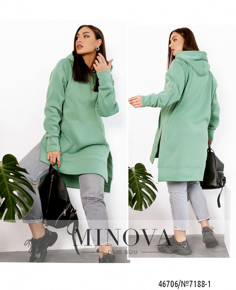 Мягкая лаконичная туника-худи отличается универсальностью, а также удачно вписываются в любой стиль. Модель свободного кроя дополнена длинными рукавами "реглан" с манжетами, карманом-кенгуру, капюшоном, разрезами по бокам, обеспечивающими дополнительный комфорт, и ассиметричным подолом.