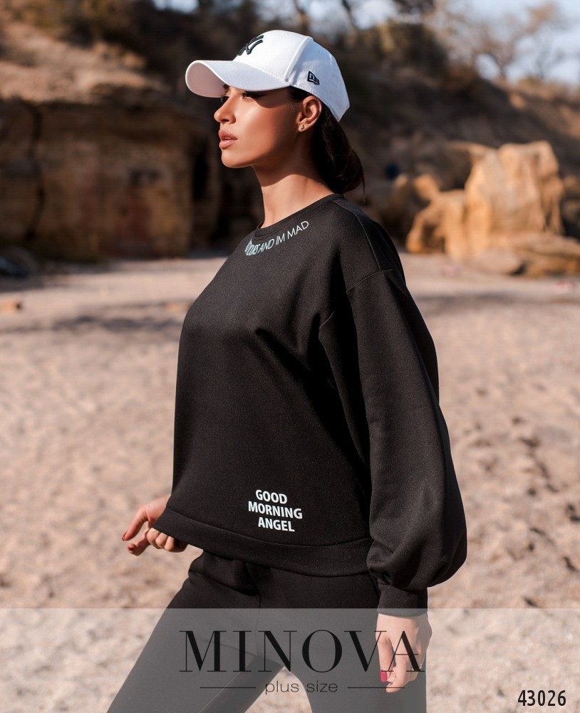 Оригинальная толстовка батал с принтом под вырезом горловины и на бедре. Епископские рукава, с мягкими манжетами. Застёжек и карманов нет.