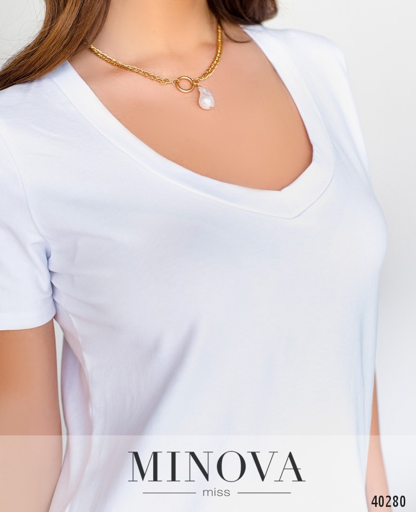 Стильная футболка с U-образным вырезом горловины, без застёжек и карманов, рукава без манжет.