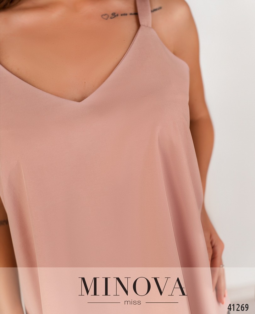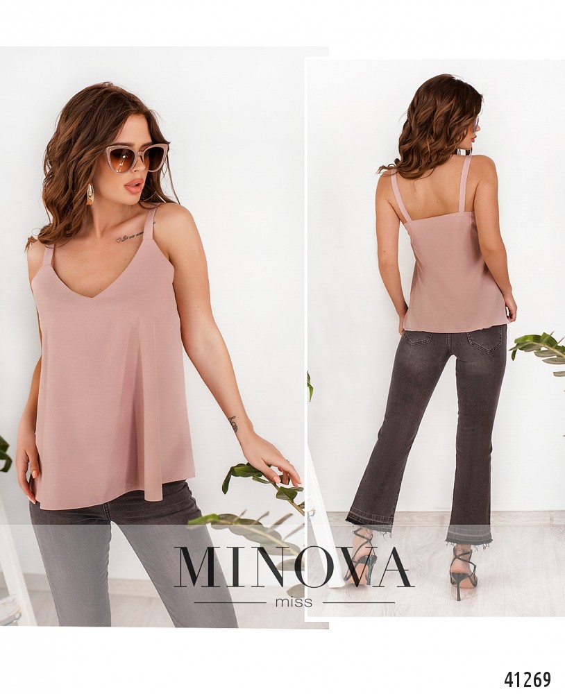 Лёгкая повседневная майка с бретельками без регулировки, вырез горловины V-образный, карманов и застёжек нет.