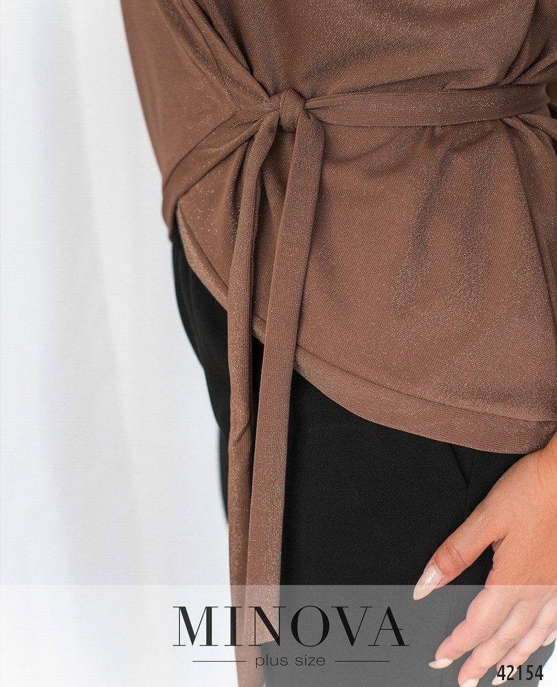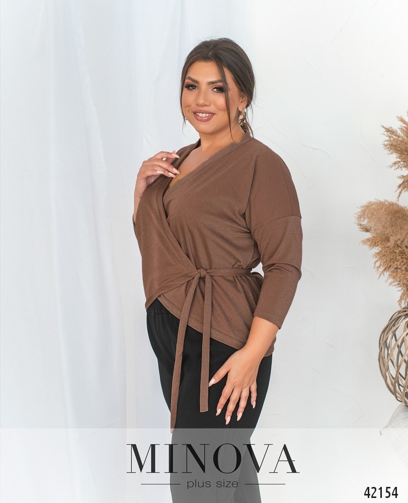 Стильная и нежная кофточка батал на запАх, завязывается на ленты снаружи и изнутри, изнутри продевается через прорезь на боку. Ткань с люрексом, рукава без манжет.