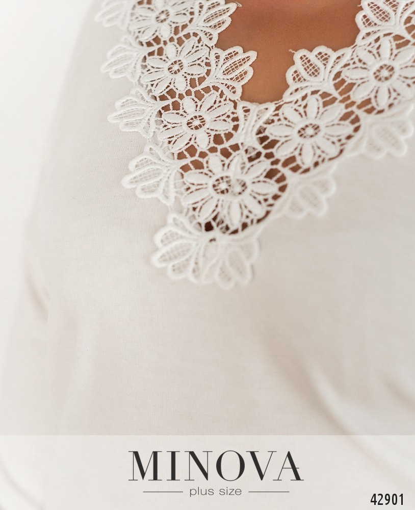 Элегантный пуловер батал с широким V-образным вырезом на груди и по спинке, украшенным цветочным кружевом. Через подол пропущен шнурок с наконечниками. Рукава без манжет. Застёжек и карманов нет.