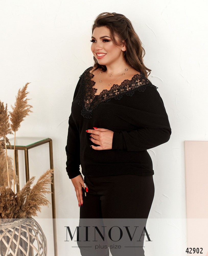 Элегантный пуловер батал с широким V-образным вырезом на груди и по спинке, украшенным цветочным кружевом. Через подол пропущен шнурок с наконечниками. Рукава без манжет. Застёжек и карманов нет.