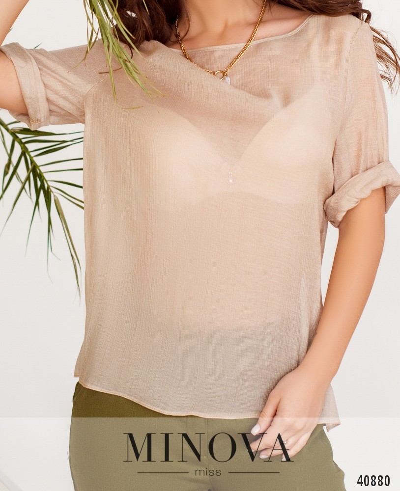 Лёгкая, воздушная, полупрозрачная блуза без застёжек и карманов, с небольшими отворотами на рукавах, вырез горловины "лодочка".