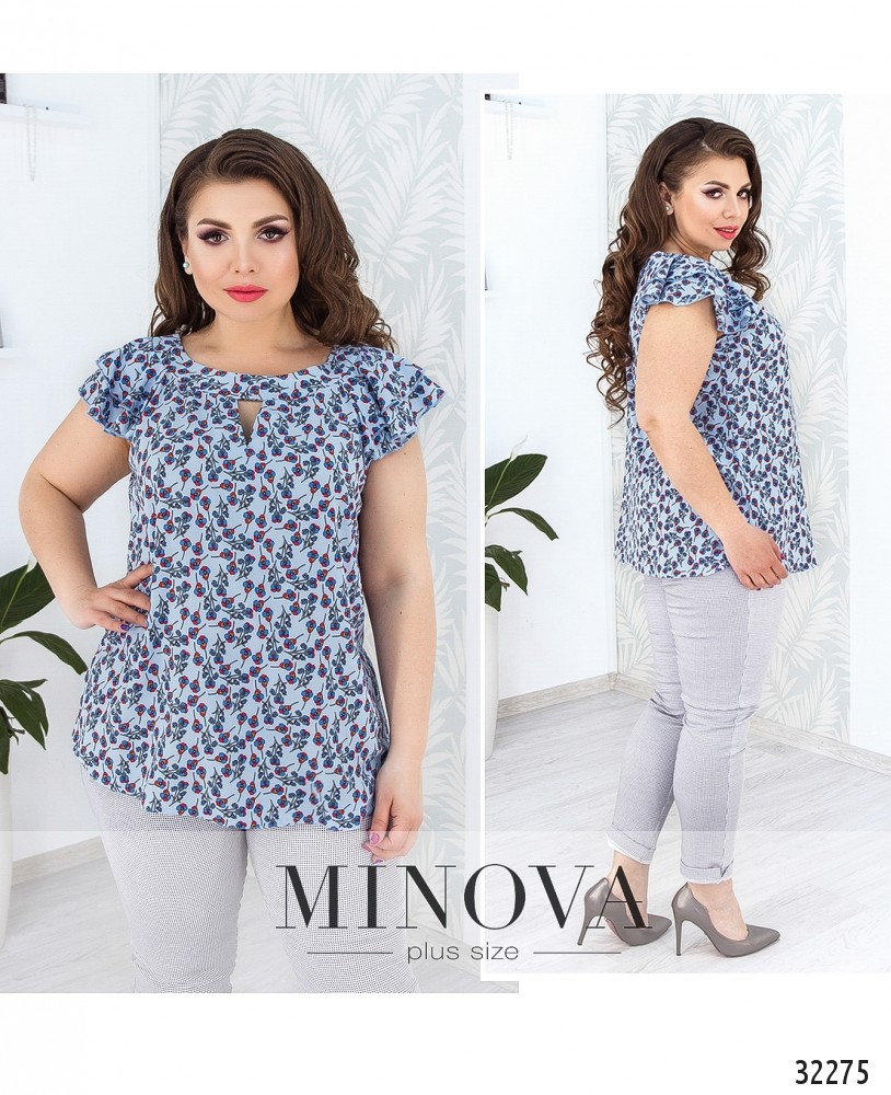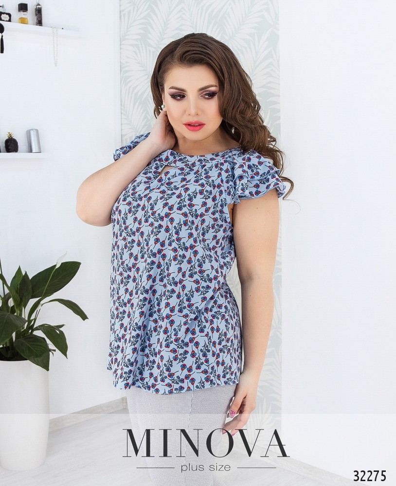 Блуза прямого кроя с круглым вырезом. Короткие рукава блузы оформлены воланами. На груди рубашка украшена вырезом.