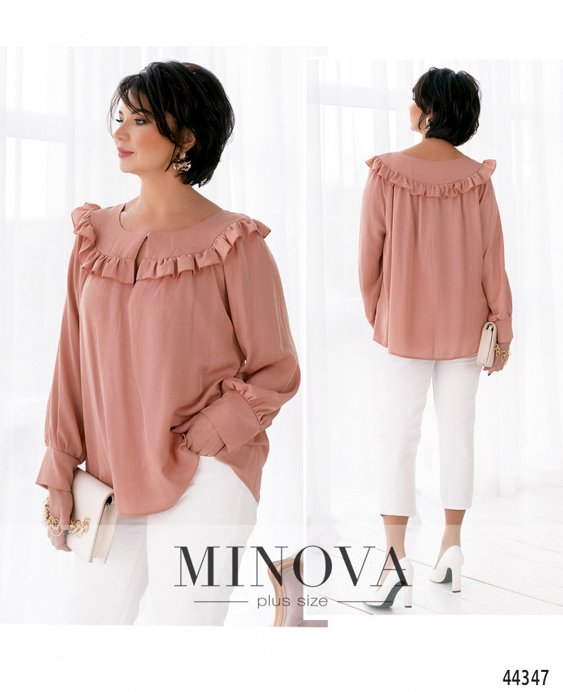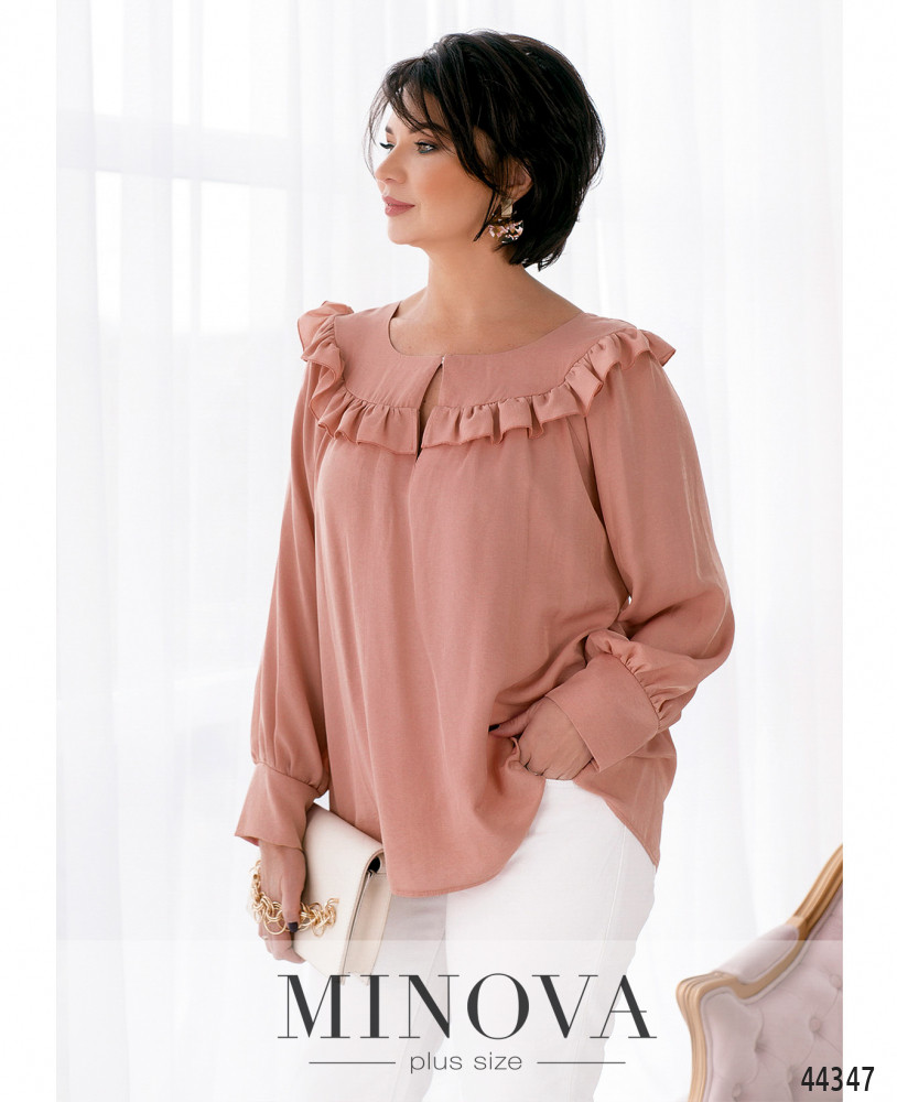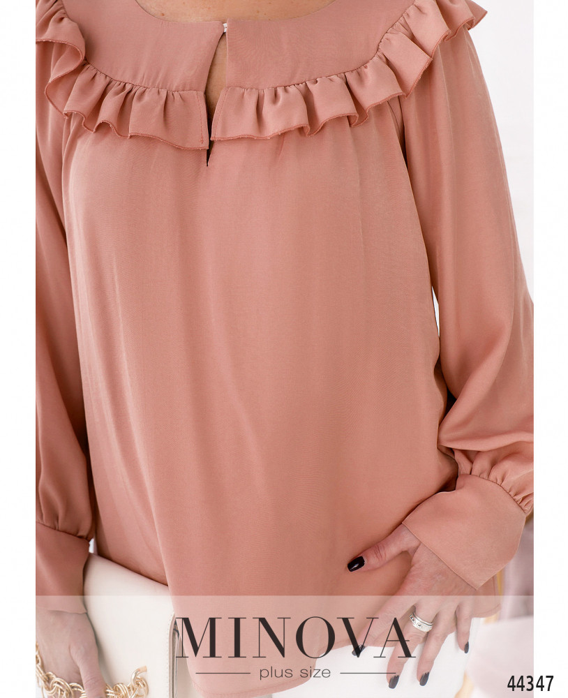 Нежная и женственная рубашка с мягкими манжетами на рукавах, без пуговиц. Застёжка - пуговка спереди под полукруглым вырезом декольте. Горловина украшена оборками. Карманов нет.