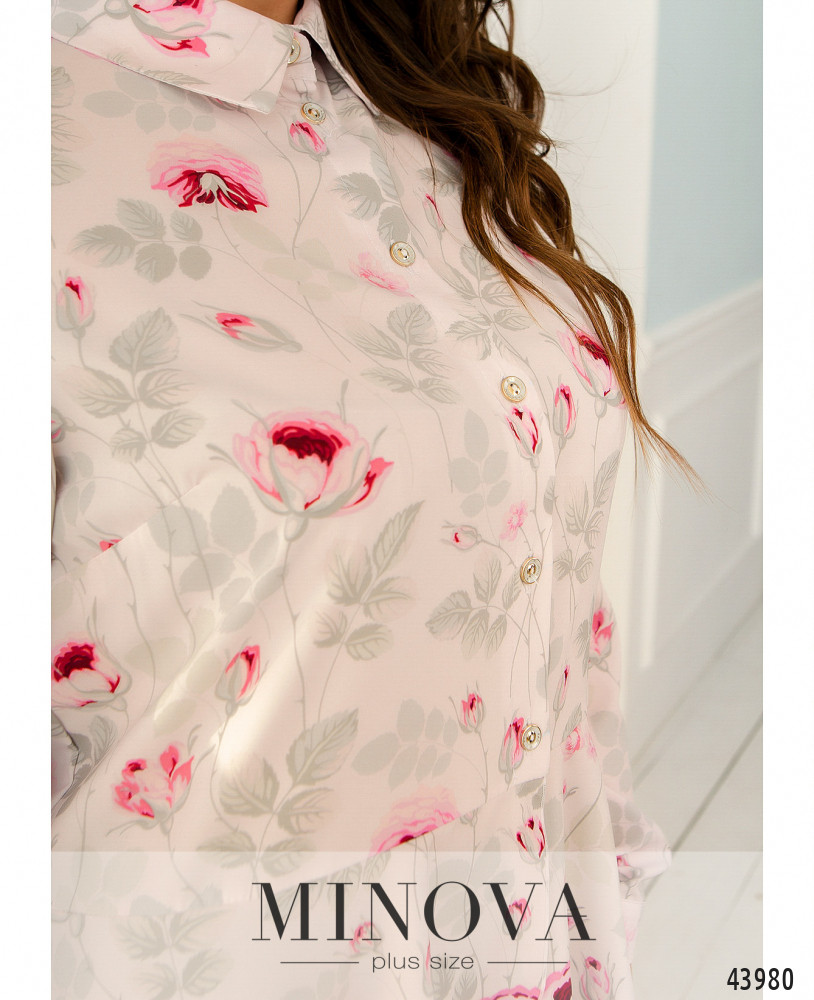 Элегантная блуза батал с нежным принтом, воротничок отложной, спереди - ряд пуговиц на планке. Рукава с манжетами, на манжетах по одной пуговке. Снизу к подолу подшиты мягкие оборки. На груди вытачки. Карманов нет.