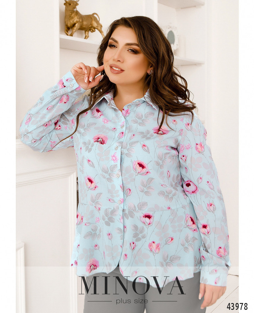 Элегантная блуза батал с нежным принтом, воротничок отложной, спереди - ряд пуговиц на планке. Рукава с манжетами, на манжетах по одной пуговке. Снизу к подолу подшиты мягкие оборки. На груди вытачки. Карманов нет.