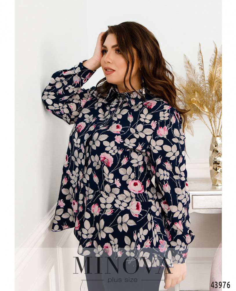 Элегантная блуза батал с нежным принтом, воротничок отложной, спереди - ряд пуговиц на планке. Рукава с манжетами, на манжетах по одной пуговке. Снизу к подолу подшиты мягкие оборки. На груди вытачки. Карманов нет.