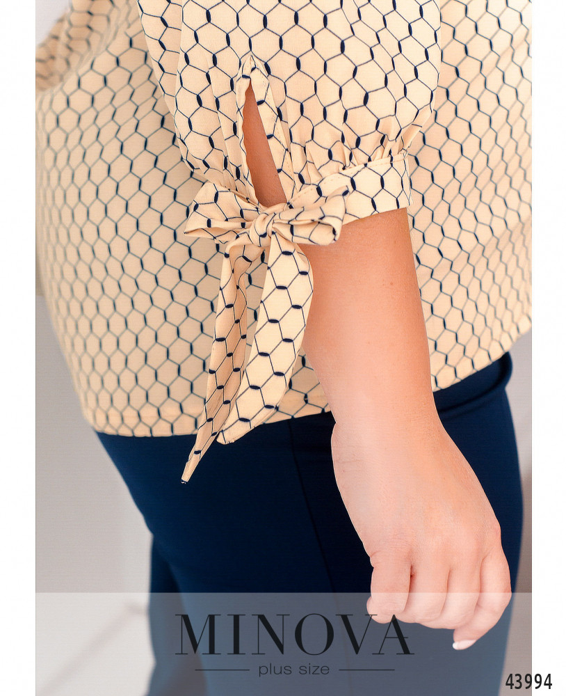 Нежная блуза батал с привлекательным принтом, на груди вытачки, рукава с мягкими манжетами, которые завязываются как ленты. Воротничок отложной, спереди - ряд пуговиц на планке. Карманов нет.
