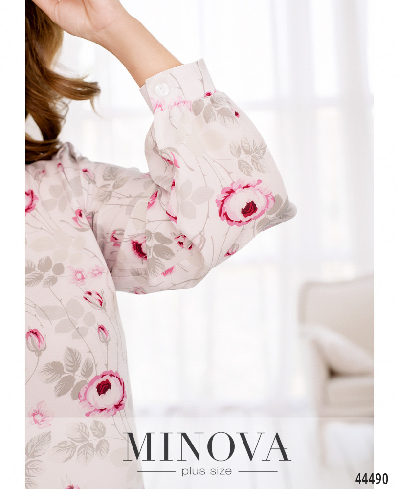 Элегантная и нежная блуза без застёжек и карманов, с полукруглым вырезом горловины. На груди диагональные вытачки. Рукав с узким манжетом, на манжетах по одной пуговке. Подол чуть длиннее по спинке.