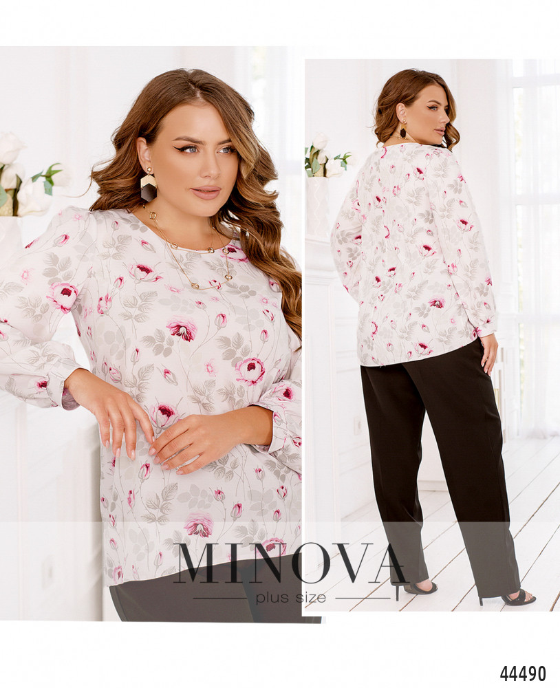 58-60 р-р: длина блузки 59-73см, длина рукава от плечевого шва 64см, обхват рукава 49см, ОГ - 122см, ОТ -129см, ОБ -134см.