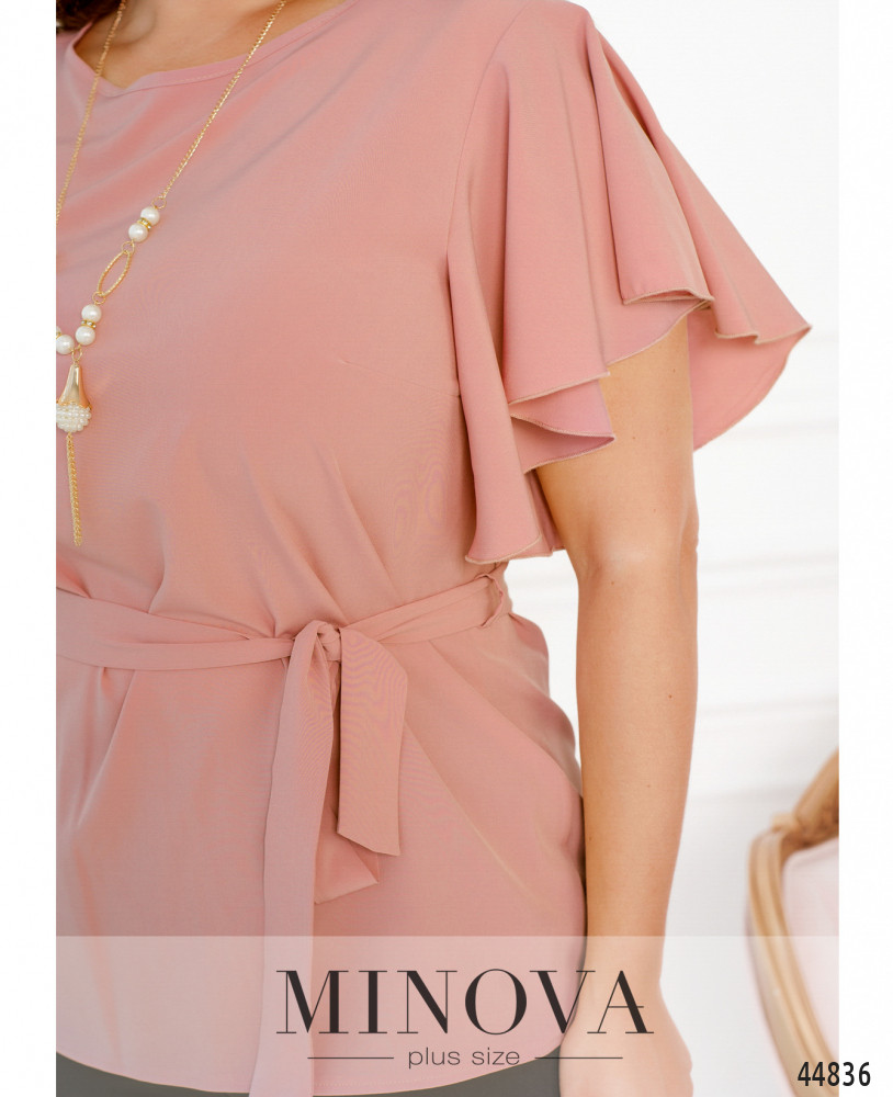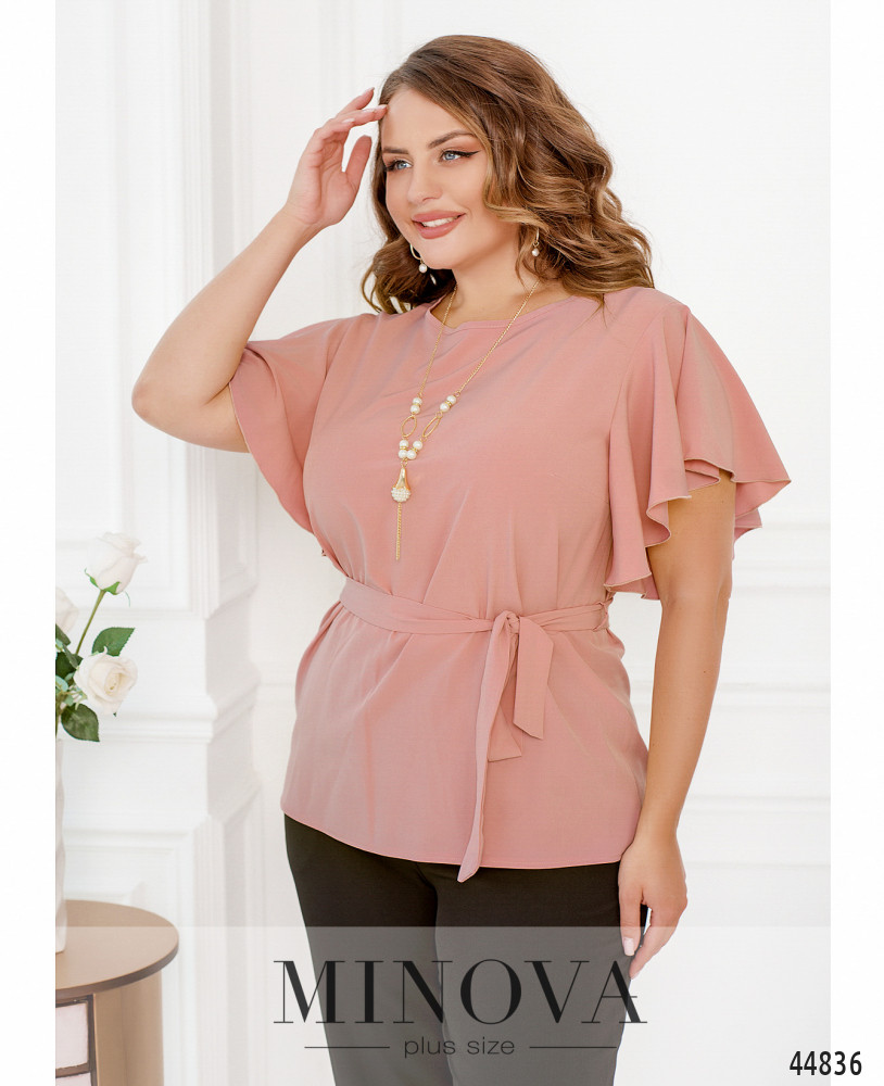 Элегантная и минималистичная блуза плюс сайз с рукавами-крылышками, ниспадающими мягкими оборками. На груди вытачки, застёжек и карманов нет, вырез горловины полукруглый. На талии по бокам подшиты шлейки для пояса.
