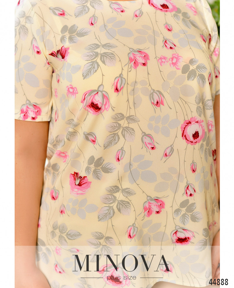Яркая и женственная блузка батал с полукруглым вырезом горловины, на груди диагональные вытачки, рукава без манжет, застёжек нет. Подол по спинке чуть длиннее.