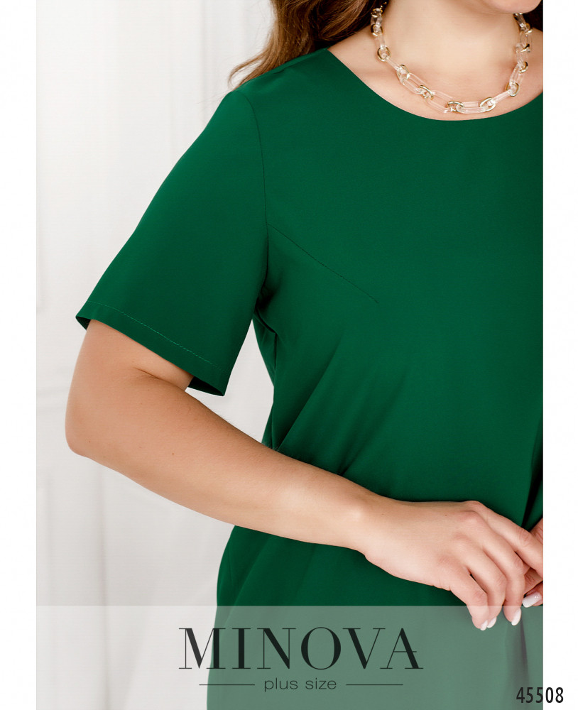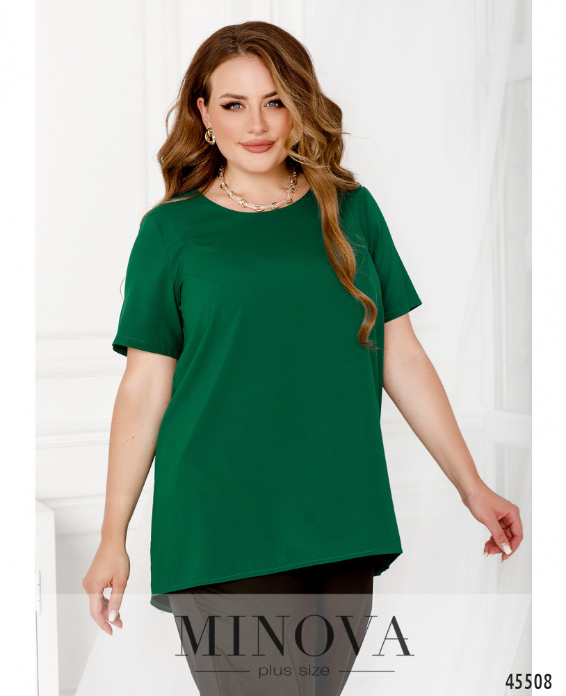 Минималистичная однотонная блуза с короткими рукавами станет одной из самых универсальных вещей в вашем гардеробе. Она удачно сочетается с юбками и брюками любых фасонов. Изюминкой этой модели А-силуэта является асимметричный подол, удлиненный по спинке, а вытачки обеспечат идеальную посадку блузы на груди.