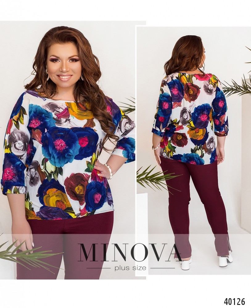 Яркая блуза с цветочным пастельным принтом, без застёжек и карманов, вырез горловины "лодочка", рукава с манжетами, на манжетах по одной пуговице. Подол присобран спереди, асимметричный.