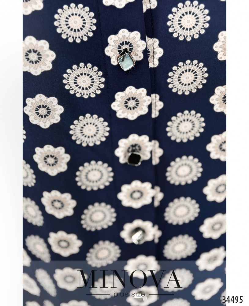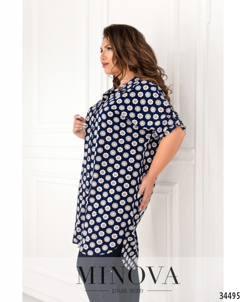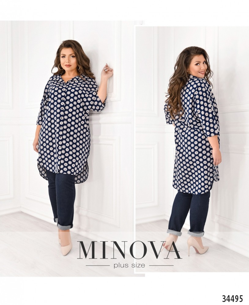 Лёгкая туника батал в стиле платья-рубашки – прекрасный выбор для повседневного гардероба. Её можно носить как самостоятельный элемент одежды или сочетать с джинсами, обувь может быть спортивной или на каблуке. Туника с широким отложным воротничком, полным рядом пуговиц от воротника до низа подола, подол асимметричный, сзади длиннее. Рукава длиной ¾, без манжет, карманы отсутствуют. Принт неброский: продольные ряды небольших круглых цветов. Такой фасон визуально стройнит и добавляет роста, так что будет удачно смотреться на девушках с фигурой типа «яблоко» или «груша».