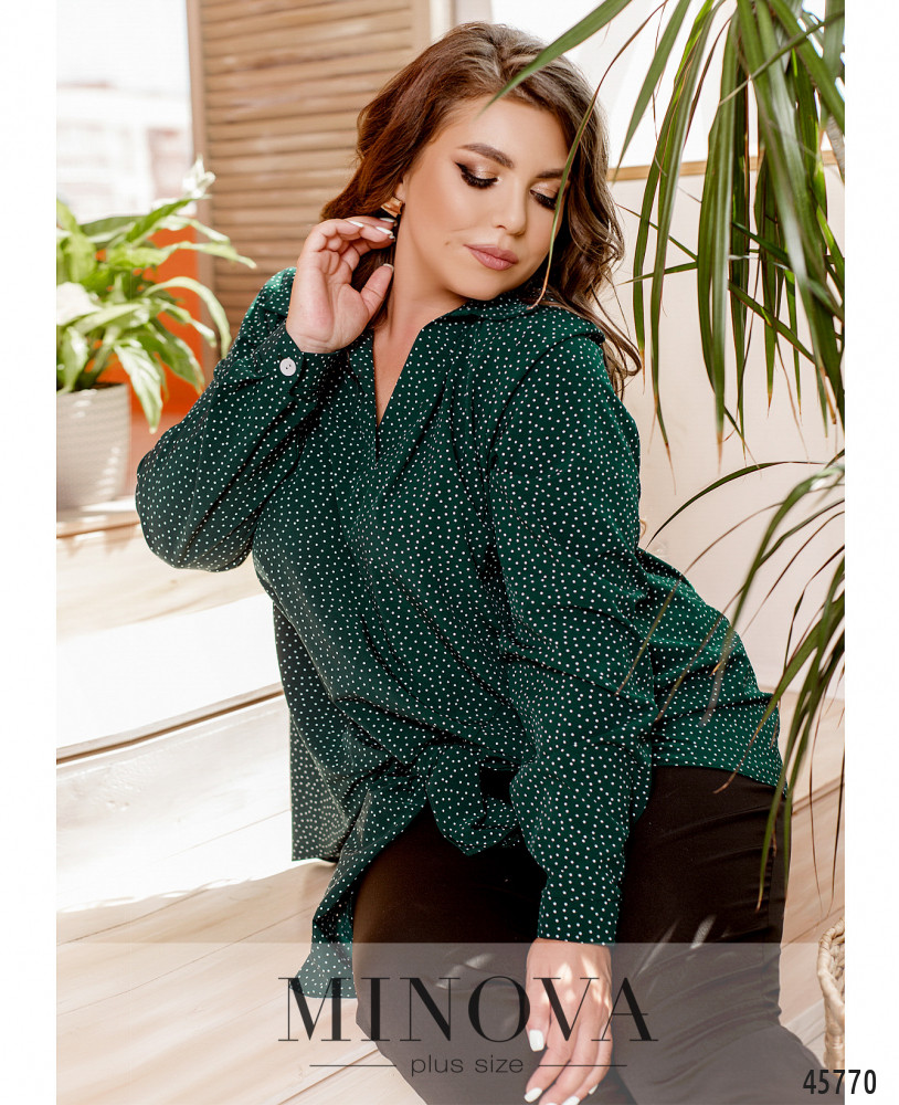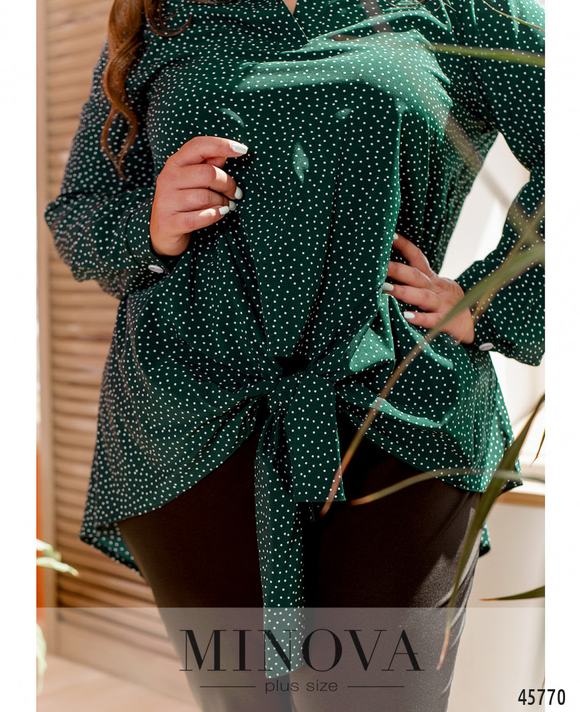 Яркая стильная рубашка с воротником и длинными рукавами с манжетами создает не только красоту, уверенность и комфорт, но и подчеркивает индивидуальный стиль. Изюминкой данной модели является ассиметричный подол, удлиненный по спинке, и завязки спереди.