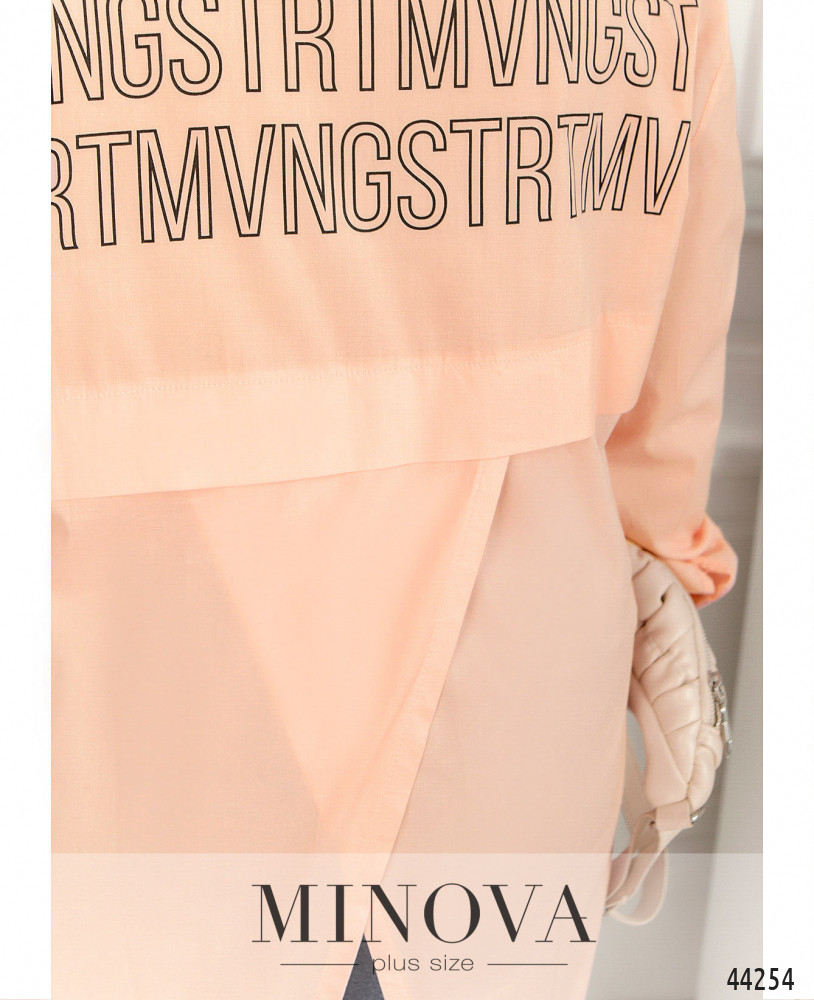 Длинная яркая рубашка батал с отложным воротничком и рядом кнопок спереди на планке, от воротничка до низу. Рукава с манжетами, на манжетах по одной кнопке, регулируются также на ленту и кнопку. Полочка и спинка декорированы принтом. Подол по спинке отрезной, запахнутый. По бокам подола - разрезы, застёгиваются на кнопки. Карманов нет. Накатка и фурнитура хорошего качества.