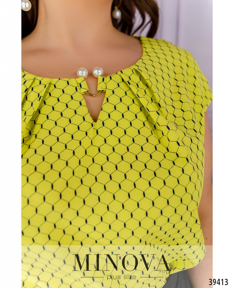 Аккуратная лёгкая блуза с рукавом-лепестком, вырез горловины полукруглый с небольшим вырезом, декорирован золотистым декором с бусинами. Карманов и застёжек нет. Ткань сверху присобрана, крой свободный.
