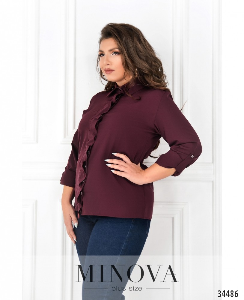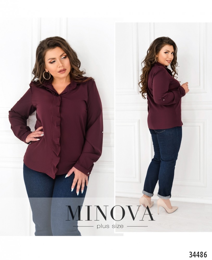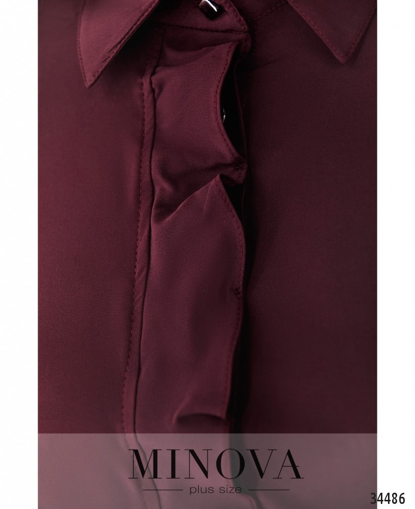 Лёгкая рубашка для твоего делового дресс-кода – уже в новой коллекции женской одежды батал от Minova! Рубашка практически классическая: отложной воротничок, полный ряд пуговиц, рукава полной длины, но регулируются на ленту и пуговку; с манжетами. Манжеты застёгиваются на одну прямоугольную пуговку на ножке, а застёжки на рубашке – круглые, скрыты под волнистыми оборками. Глубокий осенний оттенок отлично будет сочетаться с джинсами или брюками и подчеркнёт твоё чувство стиля. Рубашка будет хорошо смотреться на любой фигуре, ведь классика идеально подходит всем. Можешь дополнить свой образ подходящими аксессуарами и обувью на каблуке или плоской подошве.