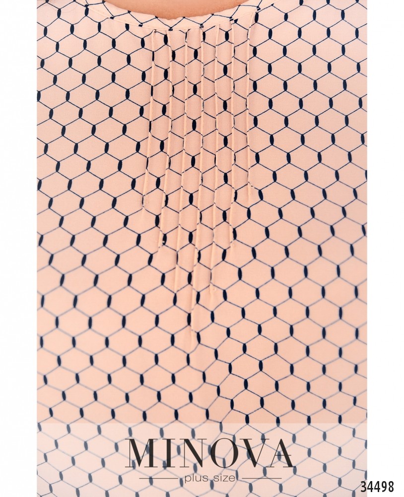 Лёгкая, воздушная и очень милая блуза батал из новой коллекции нарядов больших размеров от Minova разнообразит ваш повседневный гардероб. Блуза А-силуэта, к подолу подшит ряд плиссированных складок. Застёжек и карманов нет, рукава регулируются на пуговку и ленту, так что могут быть длиной ¾ или до локтя. Вырез горловины полукруглый, под ним – ряд небольших продольных вытачек. Принт блузы едва заметный, в виде пчелиных сот. Идеально будет сочетаться с джинсами или юбкой-карандашом, можете дополнить свой образ аксессуарами в тон или на контрасте.