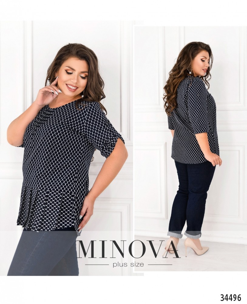 Лёгкая, воздушная и очень милая блуза батал из новой коллекции нарядов больших размеров от Minova разнообразит ваш повседневный гардероб. Блуза А-силуэта, к подолу подшит ряд плиссированных складок. Застёжек и карманов нет, рукава регулируются на пуговку и ленту, так что могут быть длиной ¾ или до локтя. Вырез горловины полукруглый, под ним – ряд небольших продольных вытачек. Принт блузы едва заметный, в виде пчелиных сот. Идеально будет сочетаться с джинсами или юбкой-карандашом, можете дополнить свой образ аксессуарами в тон или на контрасте.