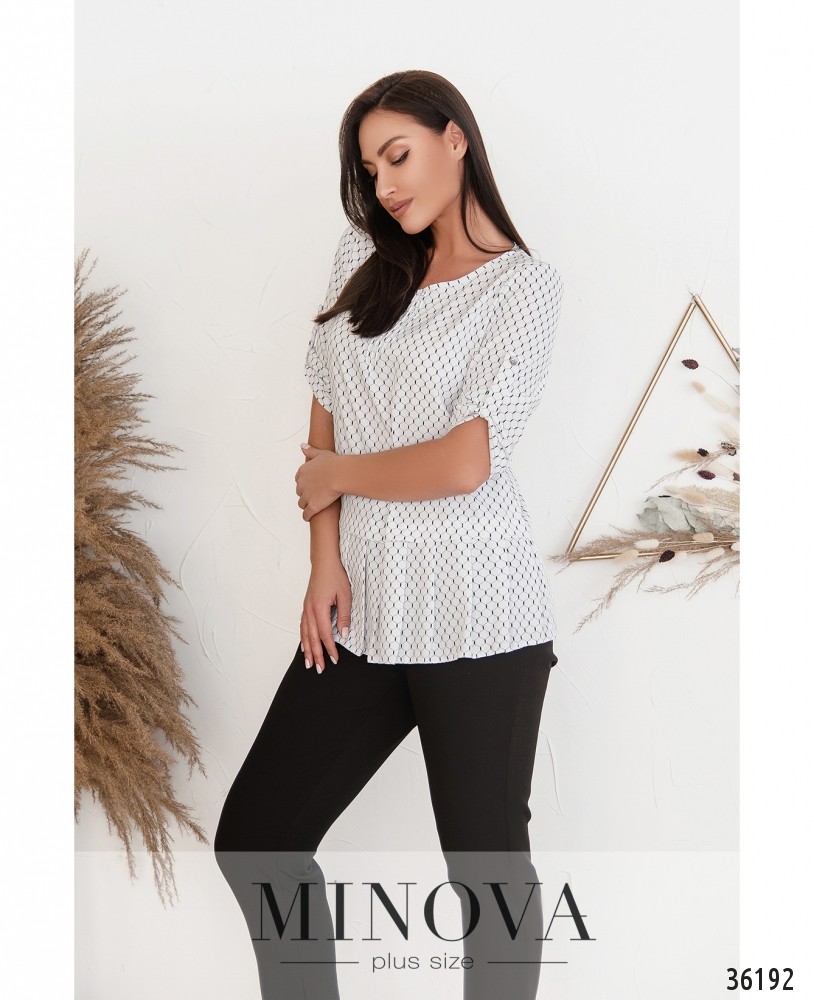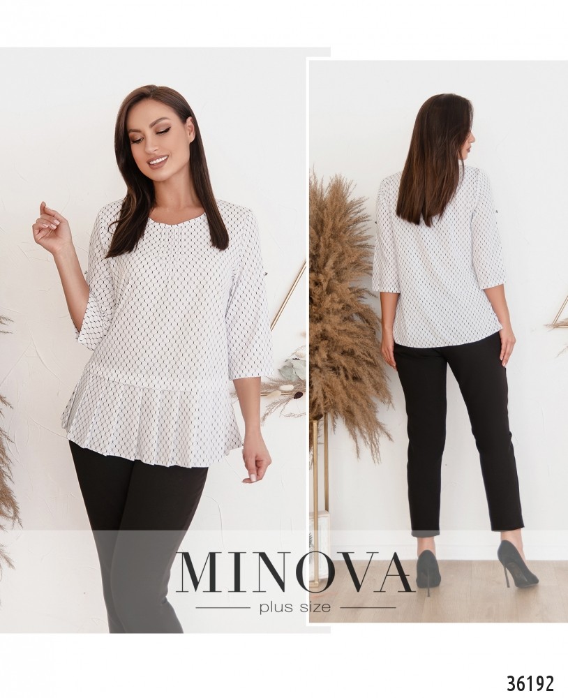 Нежная и оригинальная блузка батал из нового пополнения каталога Minova. Блуза свободного кроя, к подолу подшит ряд плиссированных складок. Вырез горловины полукруглый, неглубокий, под ним ткань присобрана продольными вытачками. Карманов и застёжек нет. Рукава длиной ¾, без манжет, но с регулировкой на ленту и пуговицу. Блуза из лёгкой ткани, с приятным универсальным принтом, который позволит вписать её в твой базовый повседневный гардероб. Носить рекомендуется навыпуск с джинсами или брюками, а также можно сочетать с юбкой-карандашом. Аксессуары лучше выбирать однотонные.