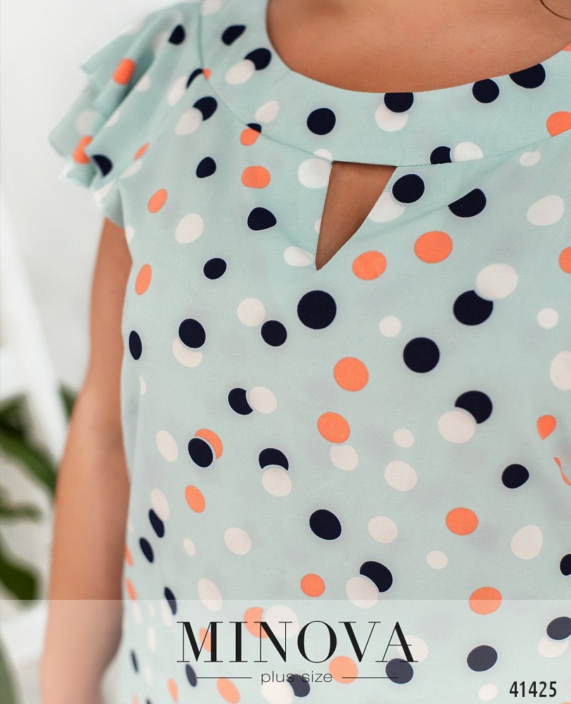 Нарядная и привлекательная блуза батал с украшенными оборками рукавами-крылышками. Вырез горловины полукруглый с небольшим "треугольником" внизу. Карманов и застёжек нет.