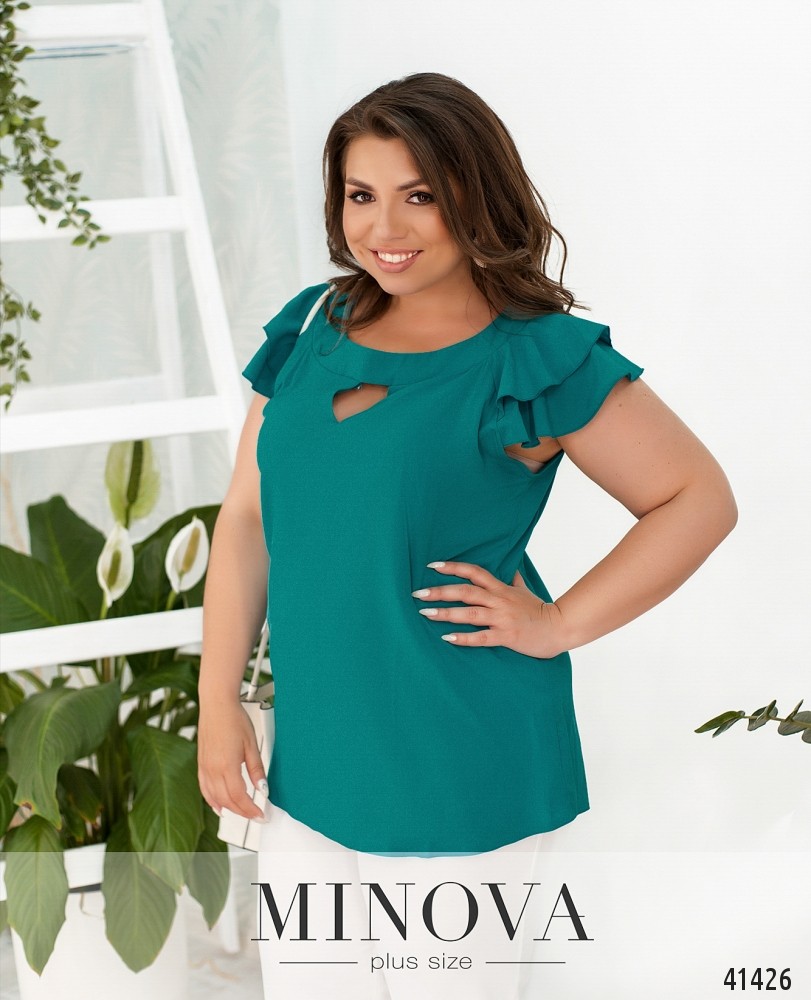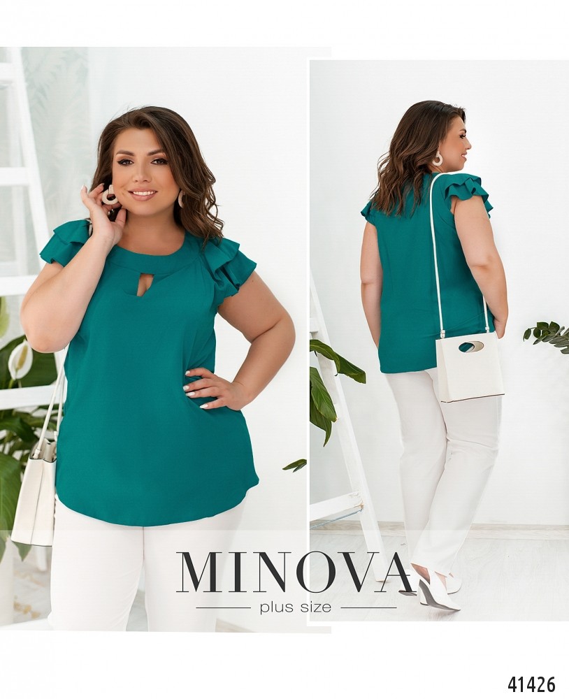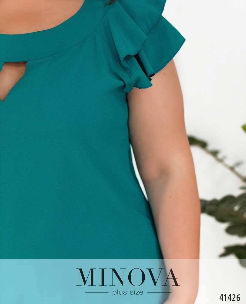 Нарядная и привлекательная блуза батал с украшенными оборками рукавами-крылышками. Вырез горловины полукруглый с небольшим "треугольником" внизу. Карманов и застёжек нет.