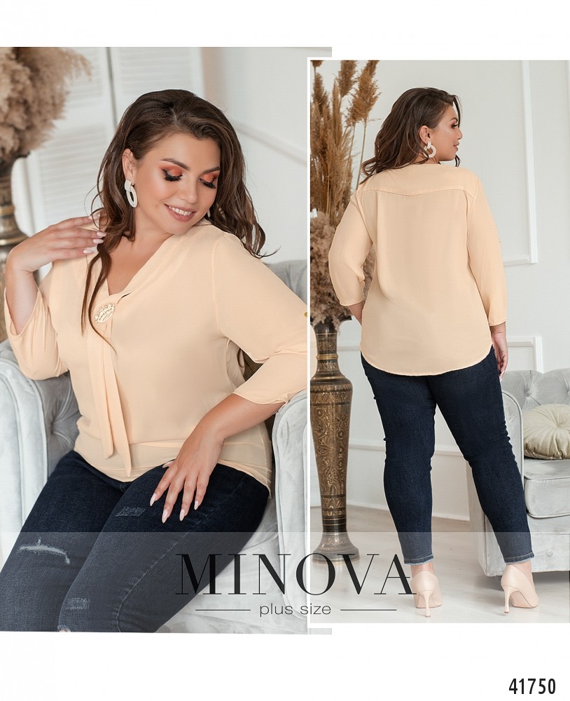 Яркая и стильная рубашка батал с рукавами, регулируемыми на ленту и пуговку. Застёжек и карманов нет, на груди ленты, которые запахиваются и закрепляются брошью. Рукава без манжет.