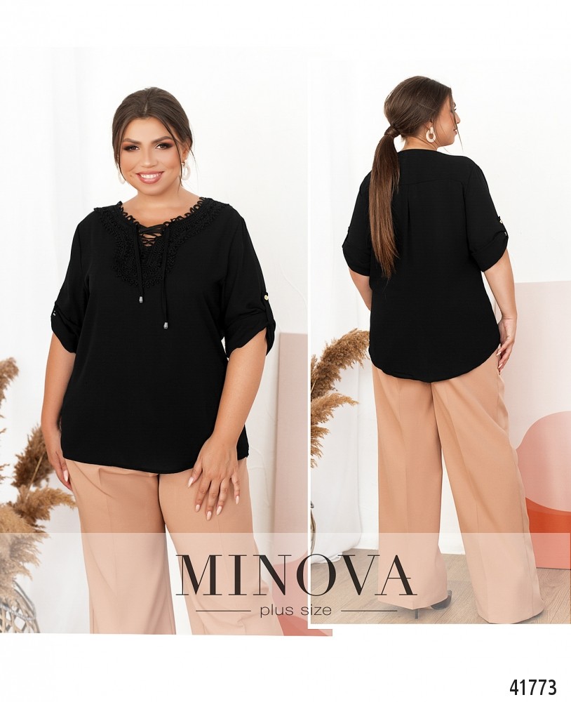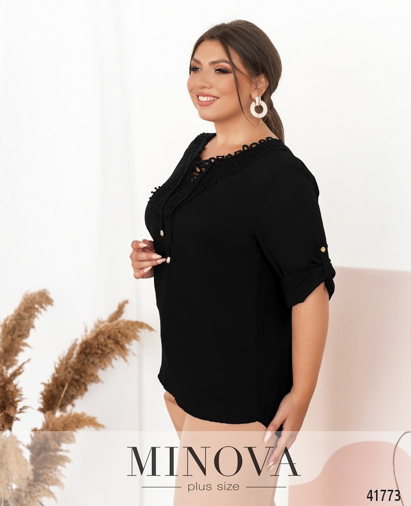 Женственная рубашка с кружевом на груди и плечах, завязывается на шнуровку, шнурки с наконечниками. Рукава регулируются на пуговку и ленту. Застёжек и карманов нет.